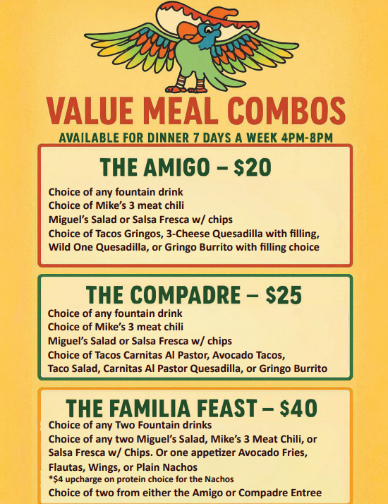 We know you have many options when it comes to choosing Mexican cuisine and we want to thank you for choosing us. Your repeat business is what helps us grow and continue to support this wonderful community. At Miguel's we really care about what you feed your family. That's why we don't prepare processed foods. We source locally to support local farmers and to make sure your entrees at Miguels are antibiotic and hormone free. We also cater to customers with different dietary restrictions. We want you to be well, live well and eat well. Come see us at Miguel's! We look forward to serving you and your family!